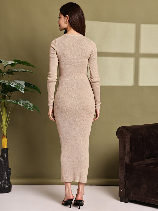 A brown acrylic knit maxi dress offering elegance with cozy comfort