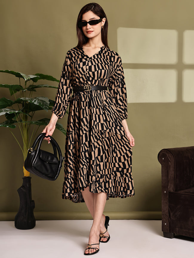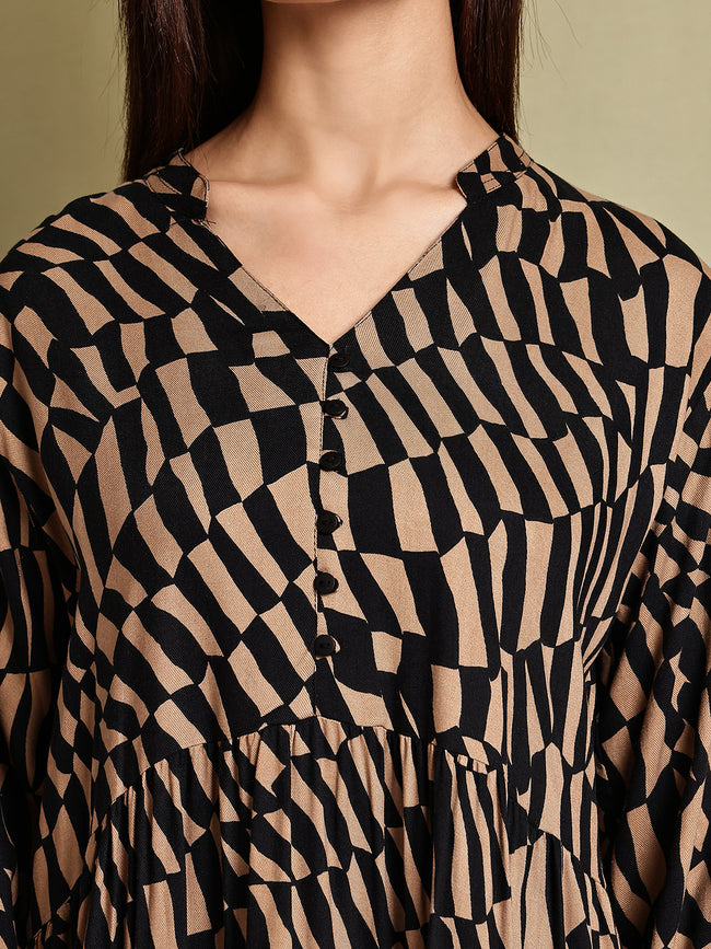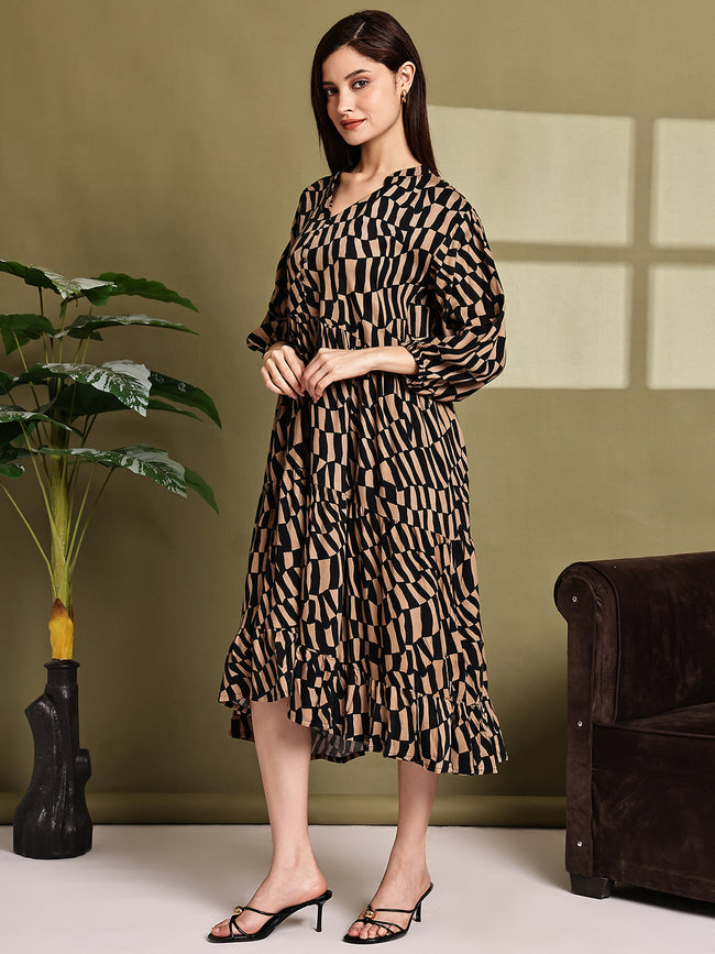 A brown printed cotton tiered midi dress perfect for a chic and relaxed look