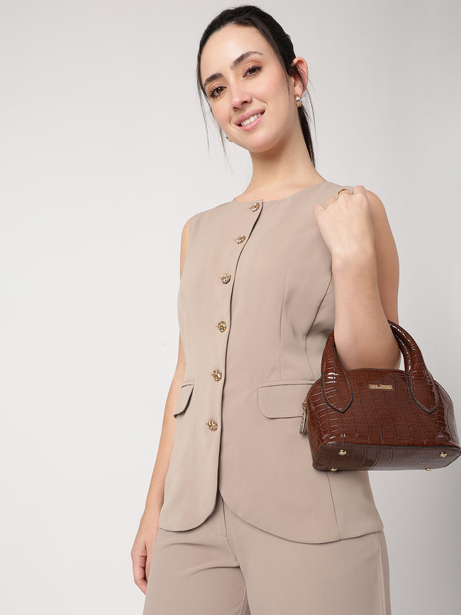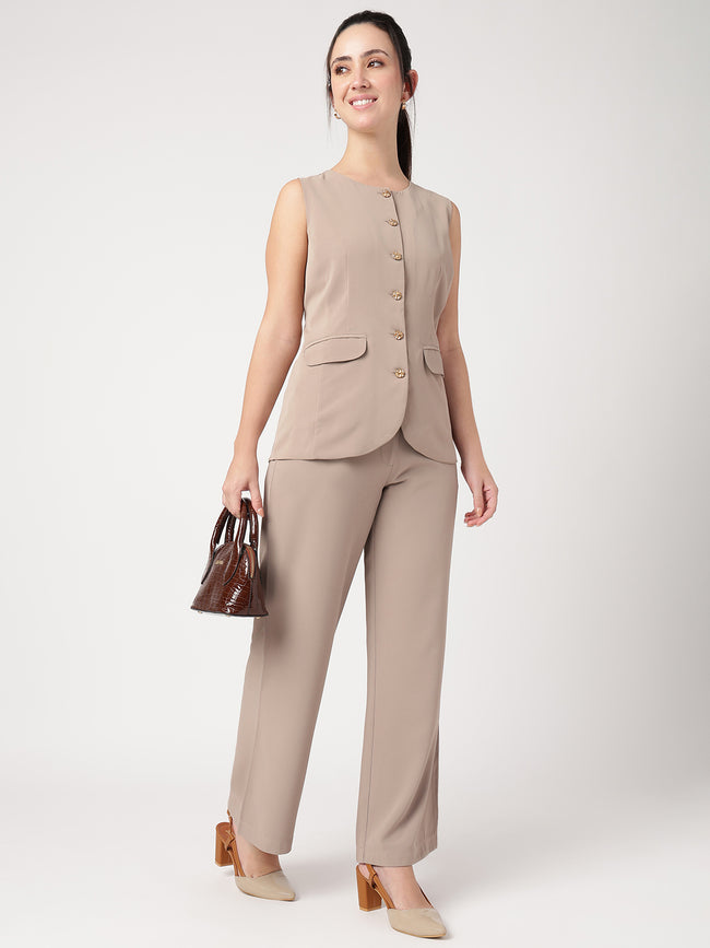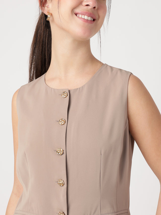 Sleek sleeveless design with gold buttons and pockets. Perfect for layering, offering a polished and versatile look for work or smart casual wear.