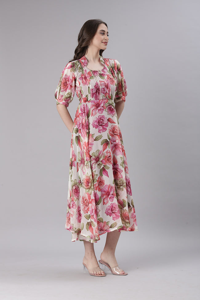 Step into effortless elegance with this **Souchii Cream floral chiffon midi dress**, designed to bring charm and sophistication to your wardrobe. Crafted from lightweight **chiffon fabric**, this dress features a **round-neckline with mandarin collar**, sheer **pleated puff sleeves**, and a flattering **belted waistline** that enhances your silhouette. The **tiered flowy hemline** creates graceful movement, making it a perfect pick for brunches, evening outings, or holiday gatherings. Its **floral print** with vibrant roses in red, white, and green adds a touch of romance to the chic cream base.