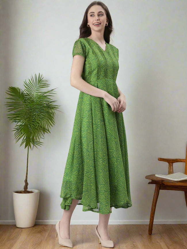 Float through the day in this Souchii dress featuring a graceful floral print, tiered midi hem, and flattering A-line silhouette. The soft neutral beige/ivory palette and semi-sheer 3/4 sleeves add effortless polish, while the button-down front and subtle waist tie define your shape. Crafted in lightweight, breathable chiffon/georgette, it’s your go-to for spring-summer outfits, brunch looks, and wedding guest dresses. Pair with strappy block heels and minimal gold jewelry for a refined, boho-chic finish.