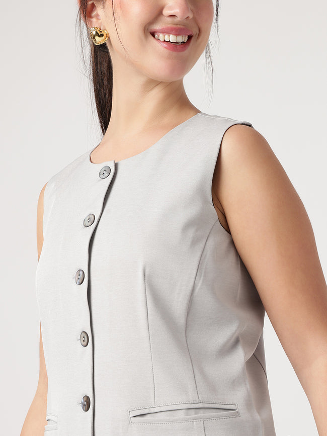 Sleeveless tailored waistcoat in light grey with a round neckline, contrast buttons, and welt pockets. Designed with princess seams and a curved front hem for a sleek, versatile silhouette.