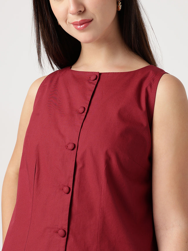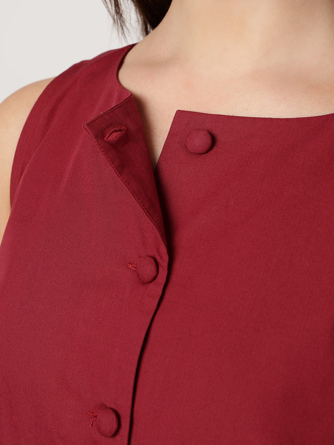 Sleeveless A-line dress in maroon with a clean round neckline and front fabric-covered button closure. Crafted for comfort and versatility, it offers a streamlined silhouette perfect for work or casual wear.