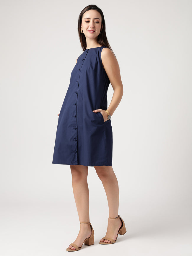 Sleeveless A-line dress in deep navy with a clean round neckline and front fabric-covered button closure. Crafted for comfort and versatility, it offers a streamlined silhouette perfect for work or casual wear.