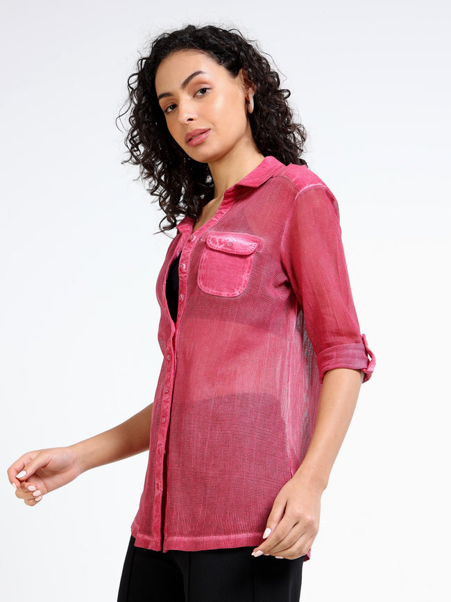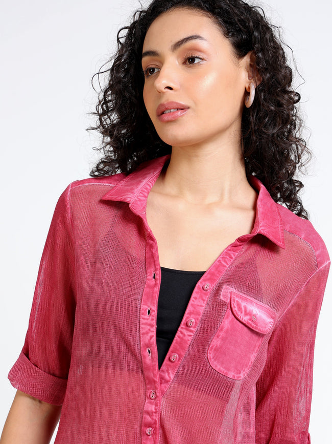 Women Pink Mesh Sheer Regular Fit Shirt