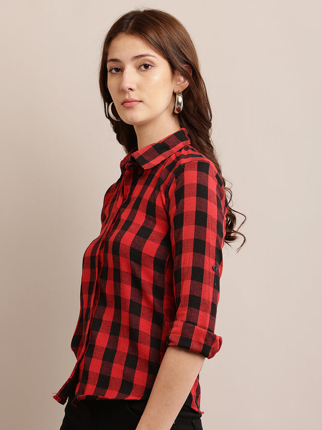 This full-sleeved red & black classic checked shirt has a collar, and buttons down the front yoke.