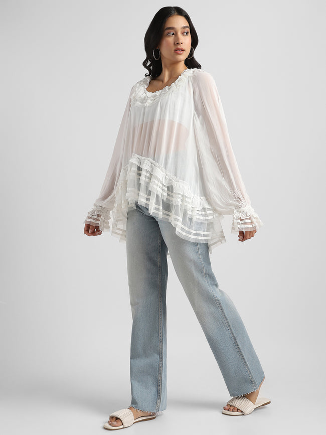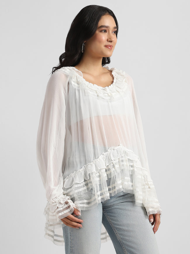 White frilled high low hem top adding elegance and playful detailing to casual wear