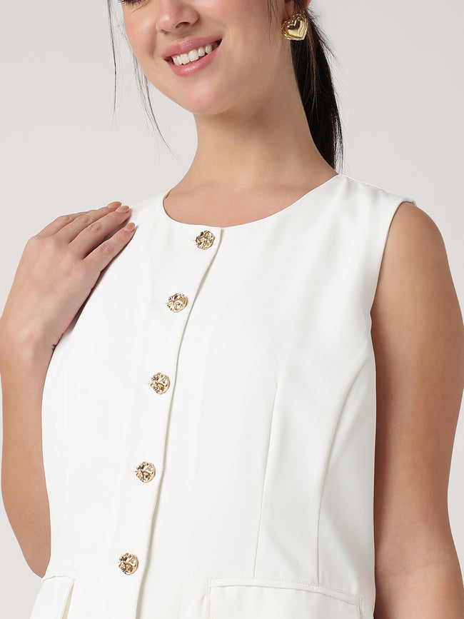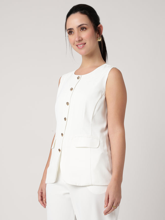 Sleek sleeveless design with gold buttons and pockets. Perfect for layering, offering a polished and versatile look for work or smart casual wear.